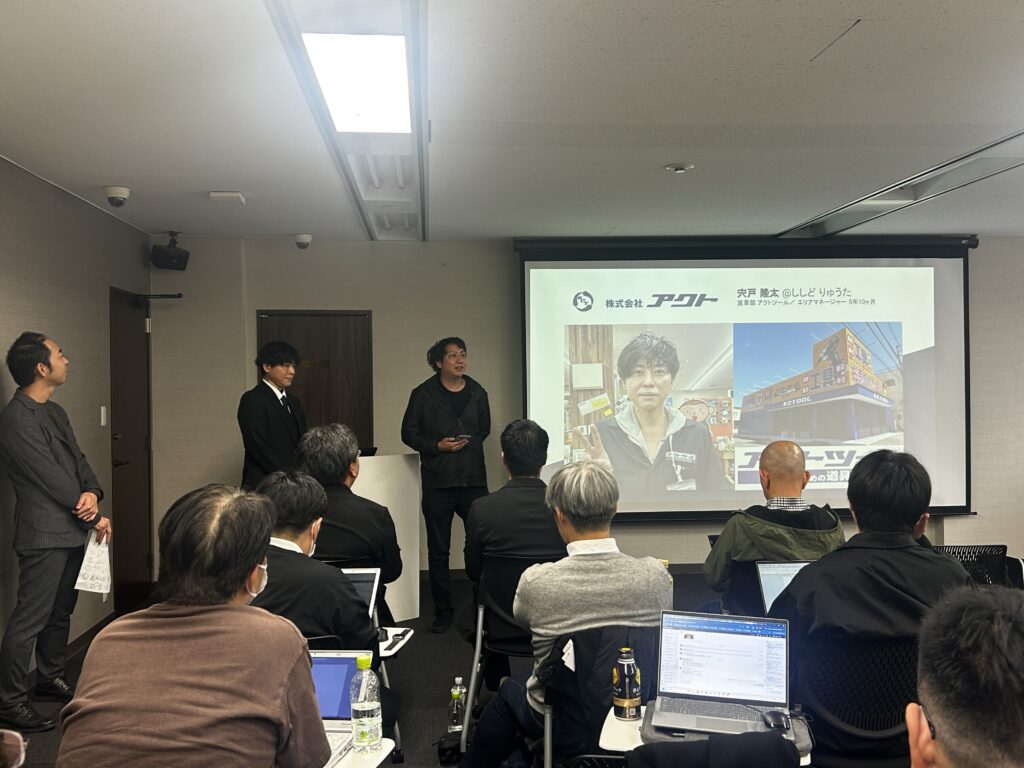 ↓3人目の発表は、株式会社アクトの宍戸様。(ちなみに、発表前には、上長からの一言紹介がございます。写真は株式会社アクトの宝生様)